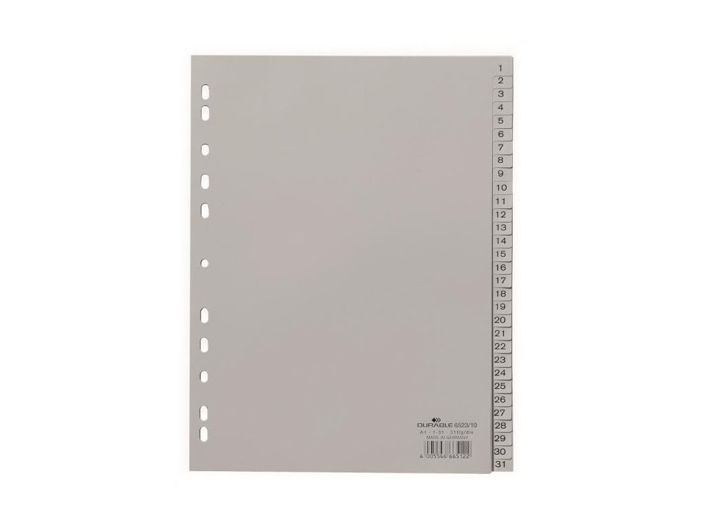 Číselný rozraďovač z polypropylénu. Formát A4, euro-dierovanie. Balenie jedna sada v polyesterovom sáčku. Väčšie balenie 10 sád. Farba sivá.Farba: sivá