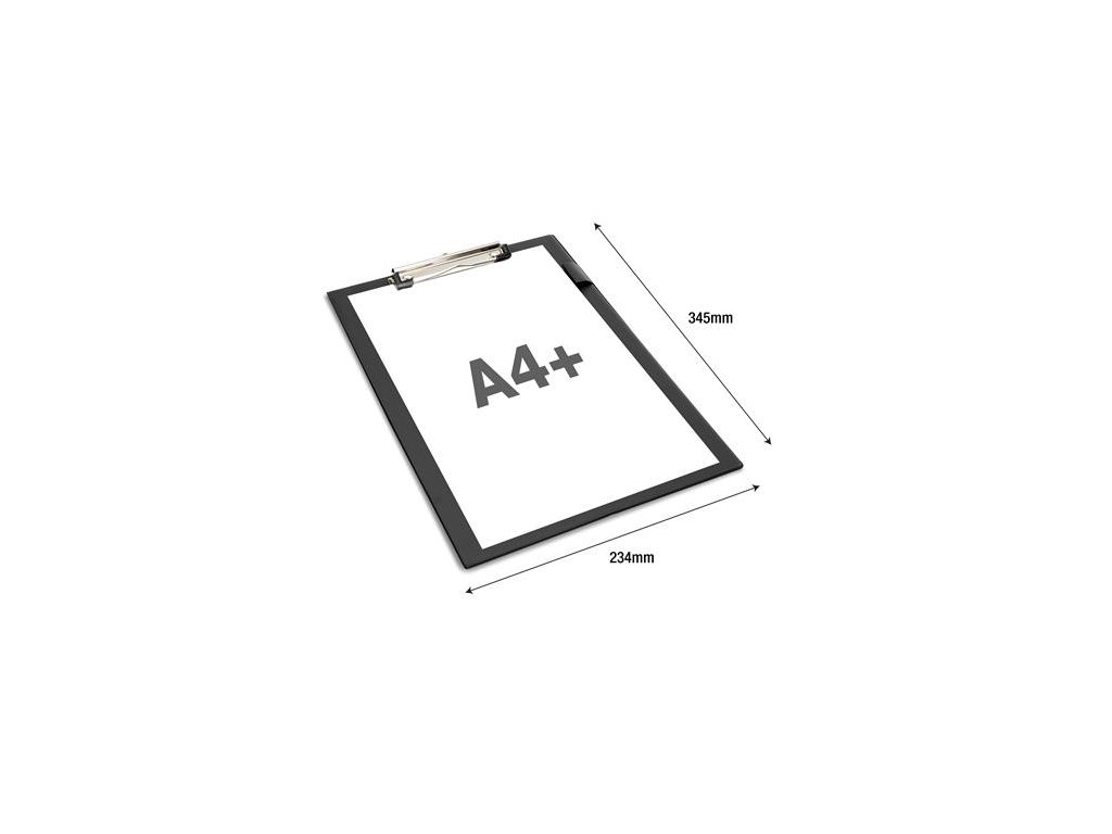 Extra silný klip s veľkou kapacitou pevne udrží papier, zatiaľ čo povrchová úprava poskytuje výnimočne hladký priestor na písanie. -s držiakom na písacie potreby -materiál: PVC -veľkokapacitný klip (max. 100 listov/ 80 g papiera) -stojatý -formát: A4+ -rozmery: 234 x 345 mm (š x v)