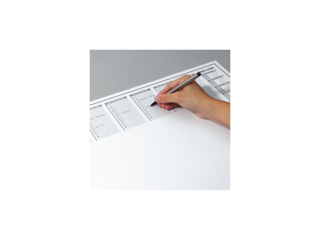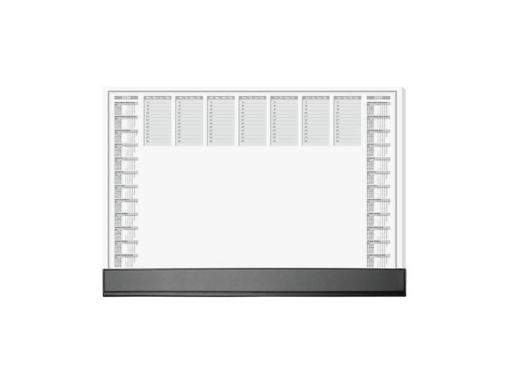 -s dvojročným kalendárom (2026/2027) -s týždenným plánovačom -štvorjazyčný: angličtina, nemčina, francúzština a holandčina -veľkosť: približne A2 -plastový pásik na spodnom okraji pre dodatočnú ochranu, na ktorom možno uchovať aj kúsky papiera -odolný, protišmykový a vďaka masívnej kartónovej zadnej doske úplne rovno leží -použiteľný aj ako podložka pod myš -40 listov -farba: sivá -s certifikátom FSC