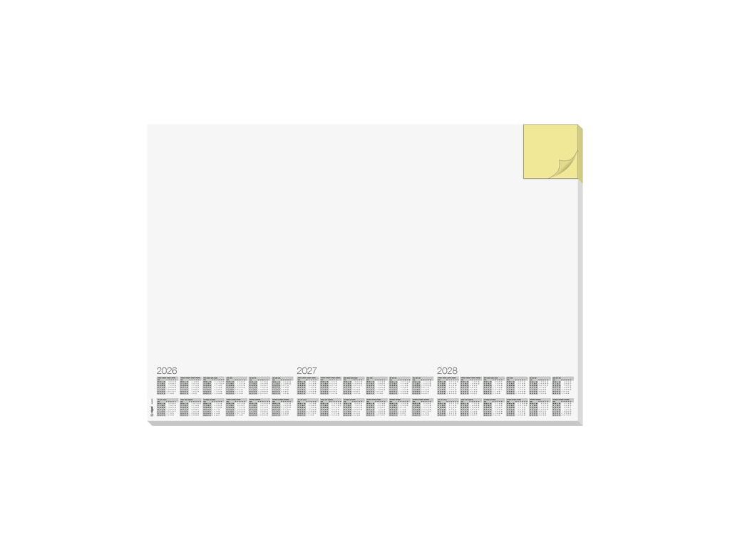 s trojročným kalendárom (2026/2027/2028) -štvorjazyčný: angličtina, nemčina, francúzština a holandčina -veľkosť: približne A2 -odolný, protišmykový a vďaka masívnej kartónovej zadnej doske úplne rovno leží -použiteľný aj ako podložka pod myš -30 listov -farba: biela -s certifikátom FSC