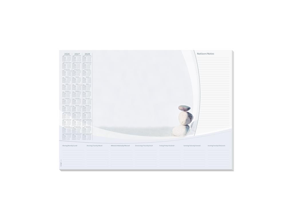 s trojročným kalendárom (2026/2027/2028) -s týždenným plánovačom -trojjazyčný: angličtina, nemčina, francúzština -veľkosť: približne A2 -odolný, protišmykový a vďaka masívnej kartónovej zadnej doske úplne rovno leží -použiteľný aj ako podložka pod myš -30 listov -farba: sivá, béžová -s certifikátom FSC