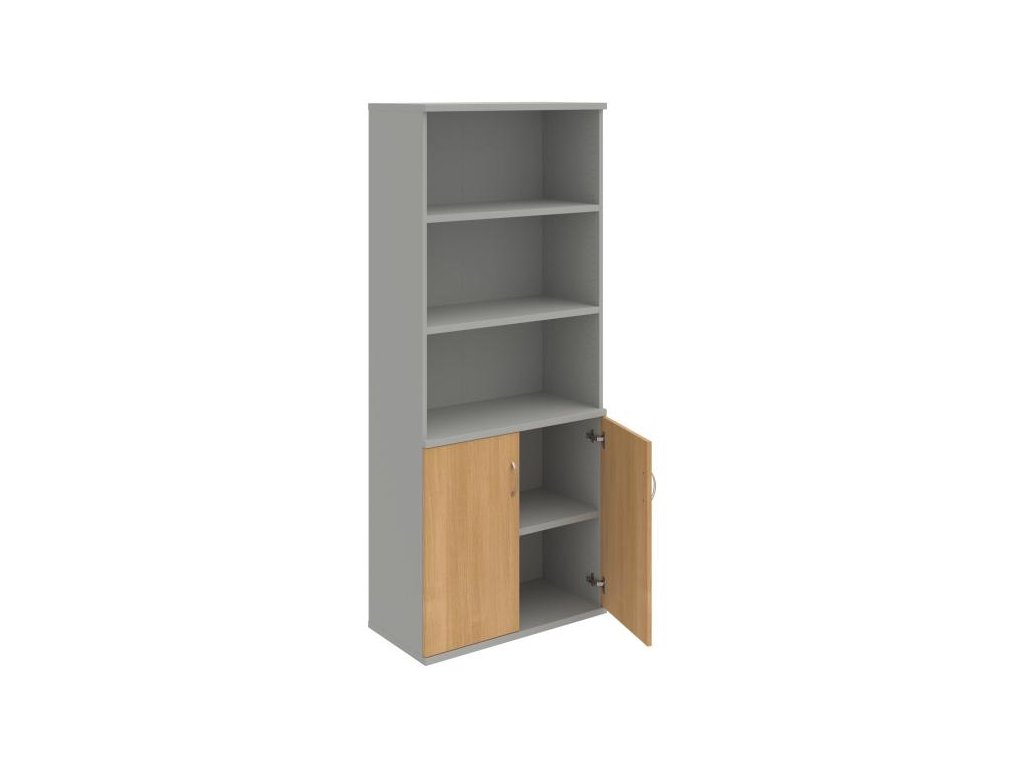Kombinovaná skriňa - dvere/nika. Kancelárske skrine STRONG majú robustnú konštrukciu a vyššiu nosnosť políc ako bežné kancelárske skrine.V ponuke sú skriňové moduly s výškou 185 cm, 111 cm alebo 74 cm a šírky 80 cm alebo 40 cm.Hĺbka všetkých modelov skriňového radu STRONG je 40 cm.Chrbát, vyrobený z 8 mm hrubých dosák, je obojstranne pohľadový, takže skrine môžete použiť ako priestorový deliaci prvok. Hrúbka samotných políc je 25 mm, čo znamená nosnosť 80 kg na 1 policu.Korpusy, dvierka a police skríň sú olepené odolnou 2mm ABS hranou, ktorá garantuje dostatočnú ochranu proti poškodeniu.