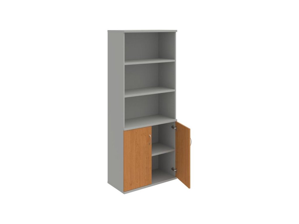Kombinovaná skriňa - dvere/nika. Kancelárske skrine STRONG majú robustnú konštrukciu a vyššiu nosnosť políc ako bežné kancelárske skrine.V ponuke sú skriňové moduly s výškou 185 cm, 111 cm alebo 74 cm a šírky 80 cm alebo 40 cm.Hĺbka všetkých modelov skriňového radu STRONG je 40 cm.Chrbát, vyrobený z 8 mm hrubých dosák, je obojstranne pohľadový, takže skrine môžete použiť ako priestorový deliaci prvok. Hrúbka samotných políc je 25 mm, čo znamená nosnosť 80 kg na 1 policu.Korpusy, dvierka a police skríň sú olepené odolnou 2mm ABS hranou, ktorá garantuje dostatočnú ochranu proti poškodeniu.