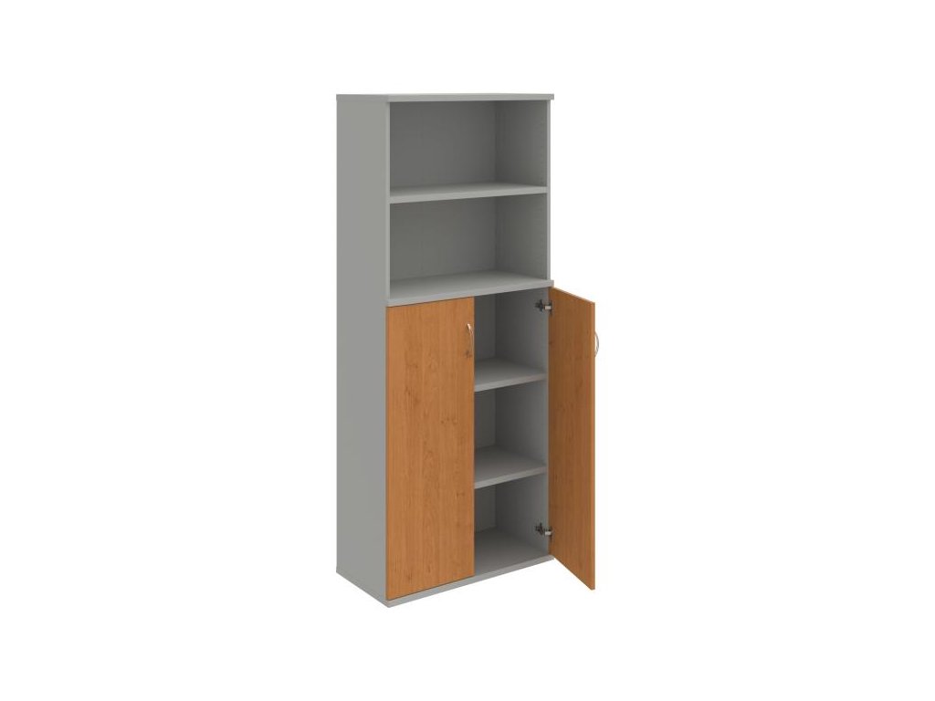 Kombinovaná skriňa - dvere/nika. Kancelárske skrine STRONG majú robustnú konštrukciu a vyššiu nosnosť políc ako bežné kancelárske skrine.V ponuke sú skriňové moduly s výškou 185 cm, 111 cm alebo 74 cm a šírky 80 cm alebo 40 cm.Hĺbka všetkých modelov skriňového radu STRONG je 40 cm.Chrbát, vyrobený z 8 mm hrubých dosák, je obojstranne pohľadový, takže skrine môžete použiť ako priestorový deliaci prvok. Hrúbka samotných políc je 25 mm, čo znamená nosnosť 80 kg na 1 policu.Korpusy, dvierka a police skríň sú olepené odolnou 2mm ABS hranou, ktorá garantuje dostatočnú ochranu proti poškodeniu.