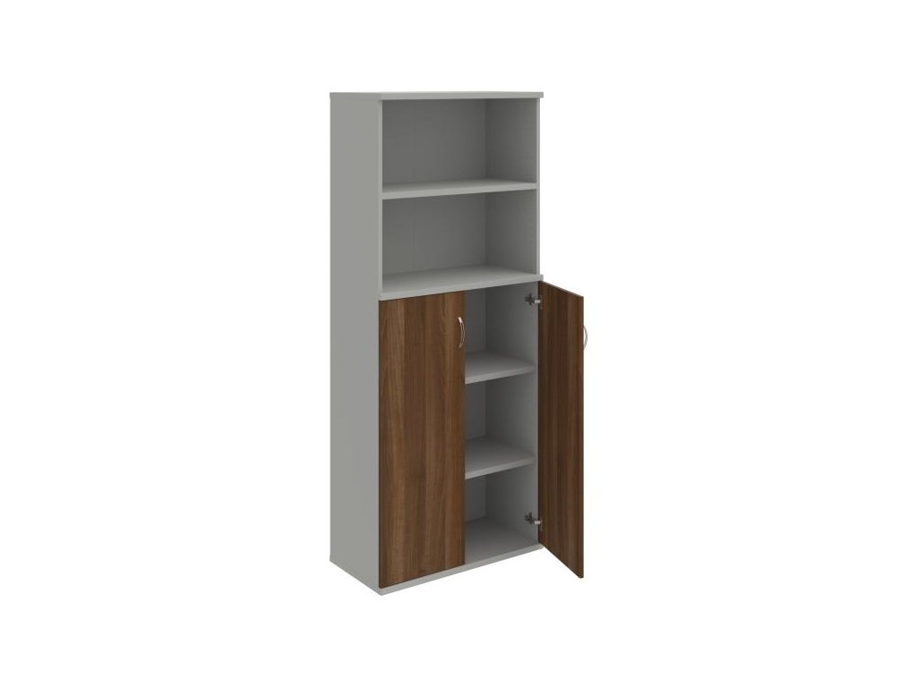 Kombinovaná skriňa - dvere/nika. Kancelárske skrine STRONG majú robustnú konštrukciu a vyššiu nosnosť políc ako bežné kancelárske skrine.V ponuke sú skriňové moduly s výškou 185 cm, 111 cm alebo 74 cm a šírky 80 cm alebo 40 cm.Hĺbka všetkých modelov skriňového radu STRONG je 40 cm.Chrbát, vyrobený z 8 mm hrubých dosák, je obojstranne pohľadový, takže skrine môžete použiť ako priestorový deliaci prvok. Hrúbka samotných políc je 25 mm, čo znamená nosnosť 80 kg na 1 policu.Korpusy, dvierka a police skríň sú olepené odolnou 2mm ABS hranou, ktorá garantuje dostatočnú ochranu proti poškodeniu.