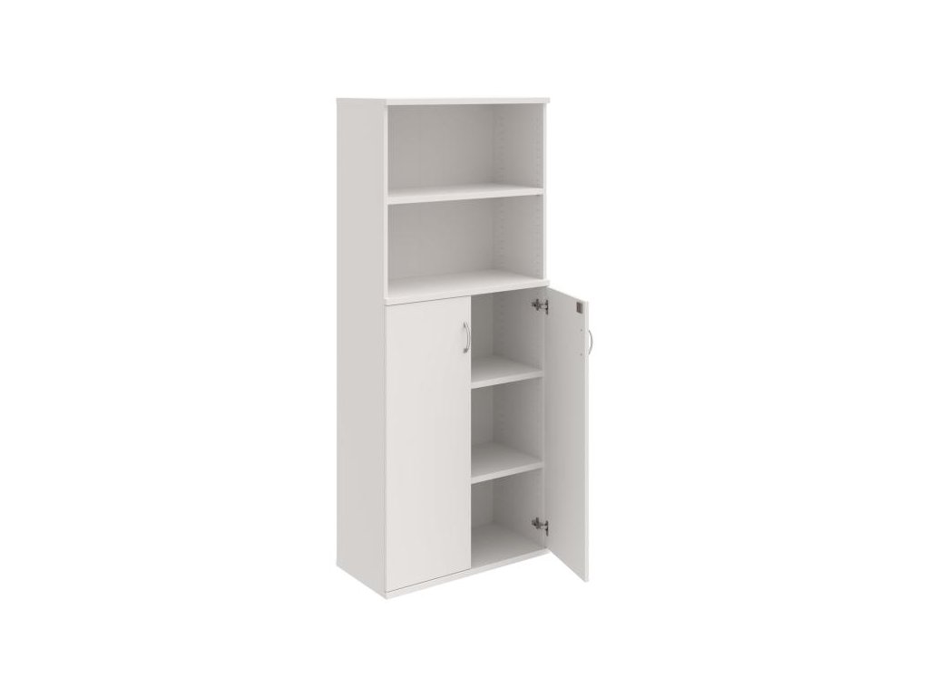 Kombinovaná skriňa - dvere/nika. Kancelárske skrine STRONG majú robustnú konštrukciu a vyššiu nosnosť políc ako bežné kancelárske skrine.V ponuke sú skriňové moduly s výškou 185 cm, 111 cm alebo 74 cm a šírky 80 cm alebo 40 cm.Hĺbka všetkých modelov skriňového radu STRONG je 40 cm.Chrbát, vyrobený z 8 mm hrubých dosák, je obojstranne pohľadový, takže skrine môžete použiť ako priestorový deliaci prvok. Hrúbka samotných políc je 25 mm, čo znamená nosnosť 80 kg na 1 policu.Korpusy, dvierka a police skríň sú olepené odolnou 2mm ABS hranou, ktorá garantuje dostatočnú ochranu proti poškodeniu.