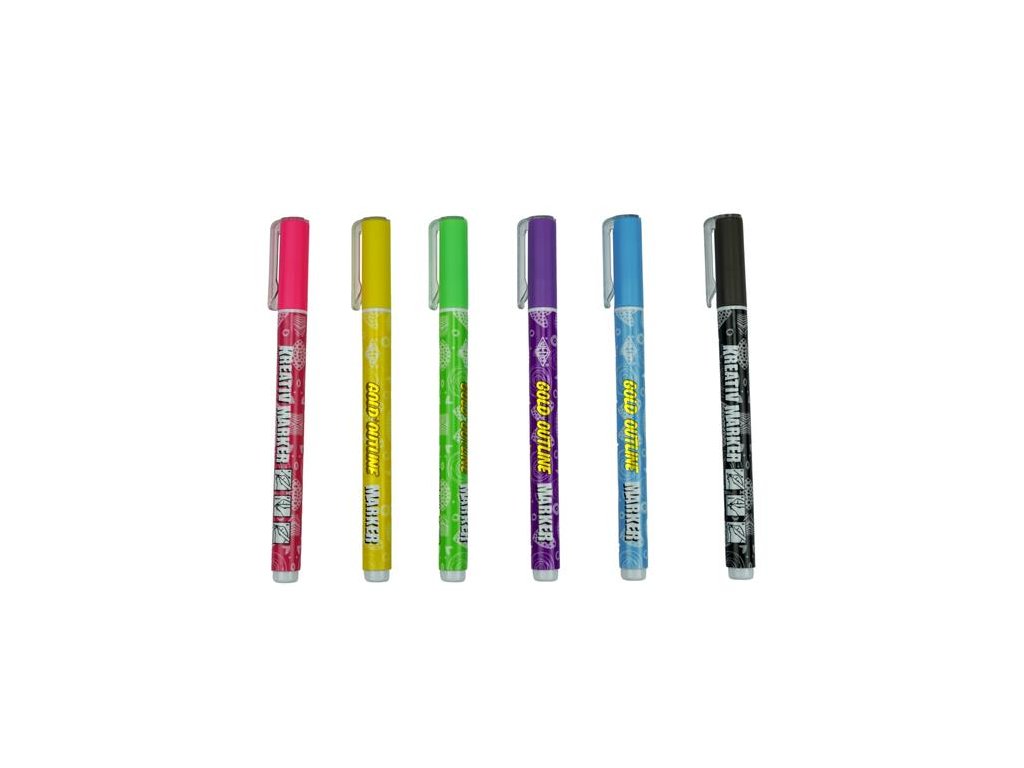 Kontúrovacie popisovače uľahčujú navrhovanie alebo zdobenie kreatívnych pohľadníc alebo pozdravov, písanie atraktívnych pohľadníc. Po krátkom stlačení hrotu je zlatý text pri písaní obklopený tenkým farebným obrysom. Celková šírka čiary je 1-2 mm v závislosti od tlaku na papier. Sada obsahuje 6 pier v ružovej, oranžovej, zelenej, svetlomodrej, tmavomodrej a čiernej farbe.Dodatočné parametre