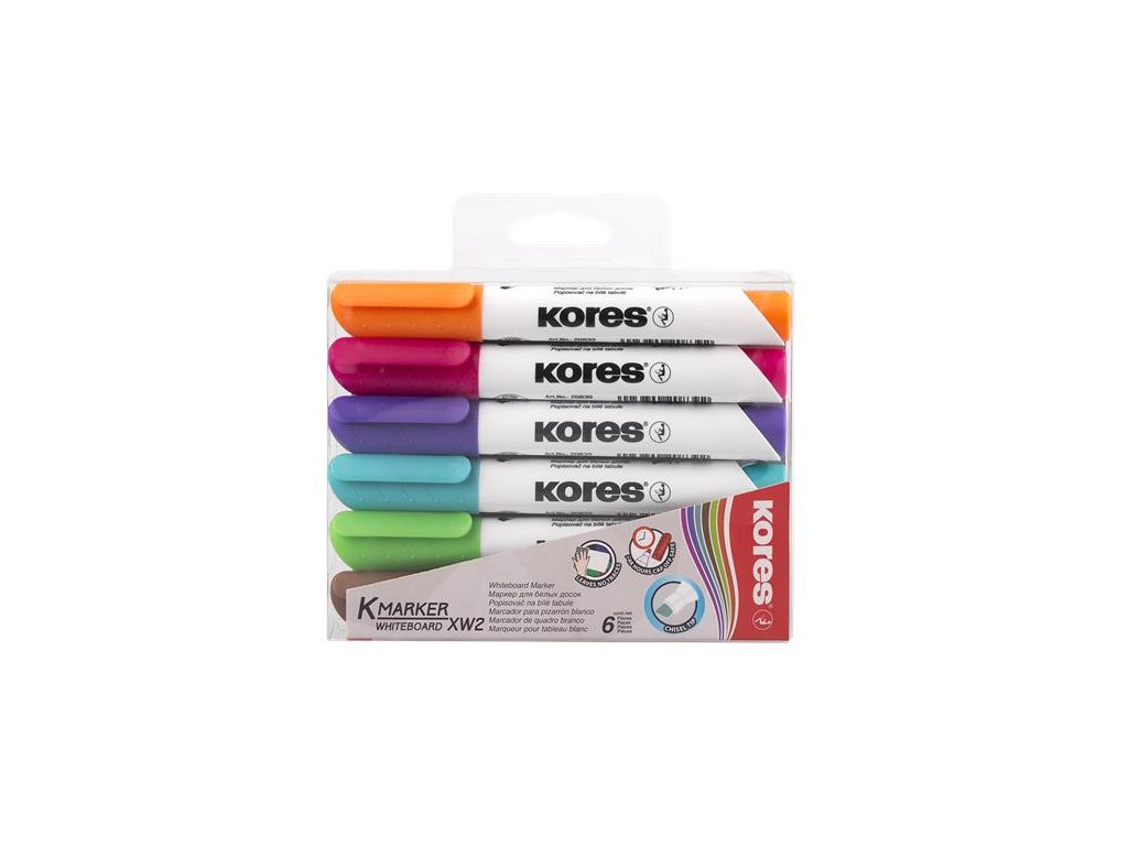 Popisovač na biele a flipchartové tabule, sada, 3-5 mm, zrezaný hrot, KORES "K-Marker XW2", 6 rôznych farieb