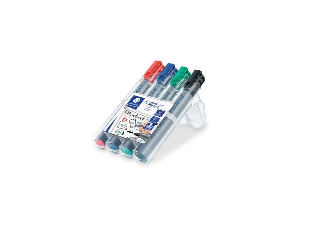 univerzálny popisovač na flipchartové tabule a papierové povrchy vodeodolný atrament na báze vody, bez zápachu bez rozpúšťadiel "Dry Safe" atrament: bez uzáveru nevyschne až 2 týždne kuželový hrot hrúbka písma: 2 mm 4 farby: modrá, červená, čierna, zelená Značka: STAEDTLER Výrobca: STAEDTLER SE Adresa: Moosäckerstr. 3 , 90427 Nuremberg, Germany Web: http://www.staedtler.com Email: https://www.staedtler.com/intl/en/service/contact/Dodatočné parametre