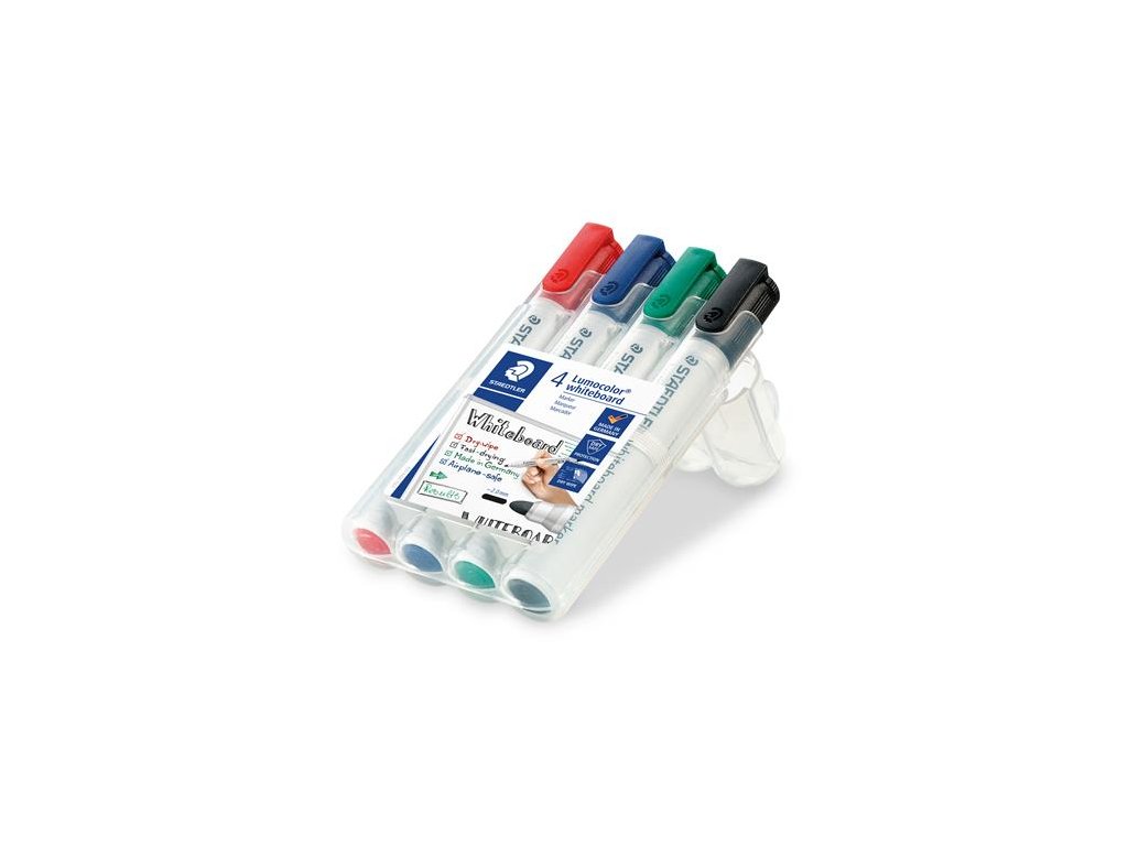 na sklo, porcelán a všetky typy bielych tabúľ kužeľový hrot hrúbka písma: 2 mm za sucha zotierateľné bez vône atrament "Dry Safe": bez uzáveru nevyschne až 2 týždne 4 farby: čierna, červená, modrá, zelená Značka: STAEDTLER Výrobca: STAEDTLER SE Adresa: Moosäckerstr. 3 , 90427 Nuremberg, Germany Web: http://www.staedtler.com Email: https://www.staedtler.com/intl/en/service/contact/Dodatočné parametre