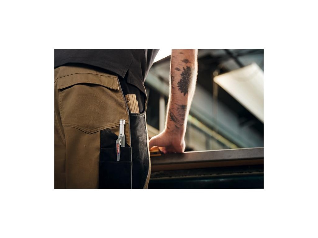 Popisovač na značenie otvorov v praktickom puzdre, pre presné značenie na takmer akýkoľvek materiál, ako napr drevo, kov, plast, dlaždice a lepenka.- robustné hliníkové telo
