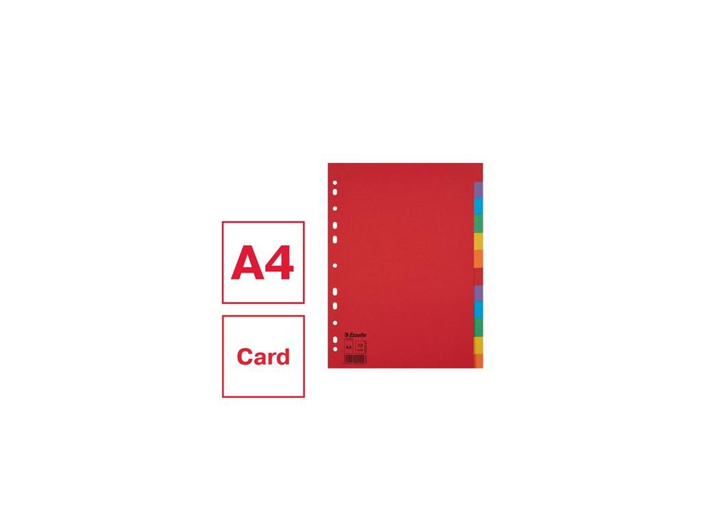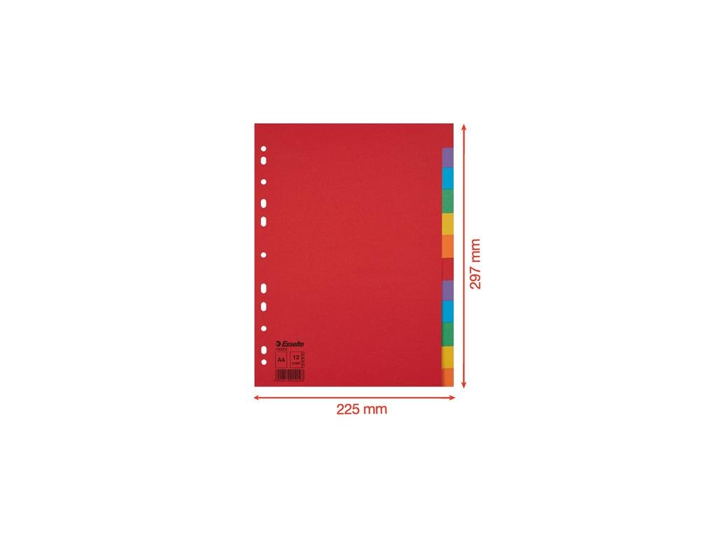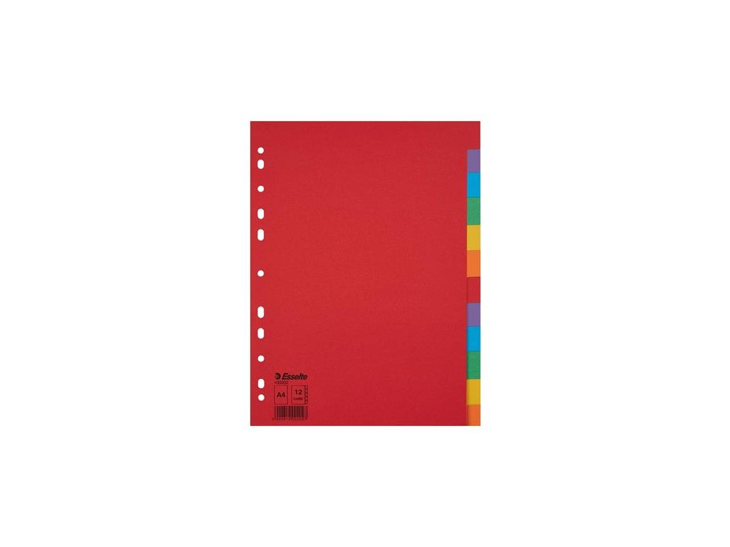 formát: A4 pre triedenie založených dokumentov recyklovaný odolný kartón, 160 g/m2 farebné listy počet dier: 11 Značka: ESSELTE Výrobca: Esselte Kft. Adresa: 1139 Budapest, Lomb u. 37-39. A ép. II. 8., Hungary Web: https://www.accobrands.com/brands/ Email: hungarymarketing@acco.comDodatočné parametre