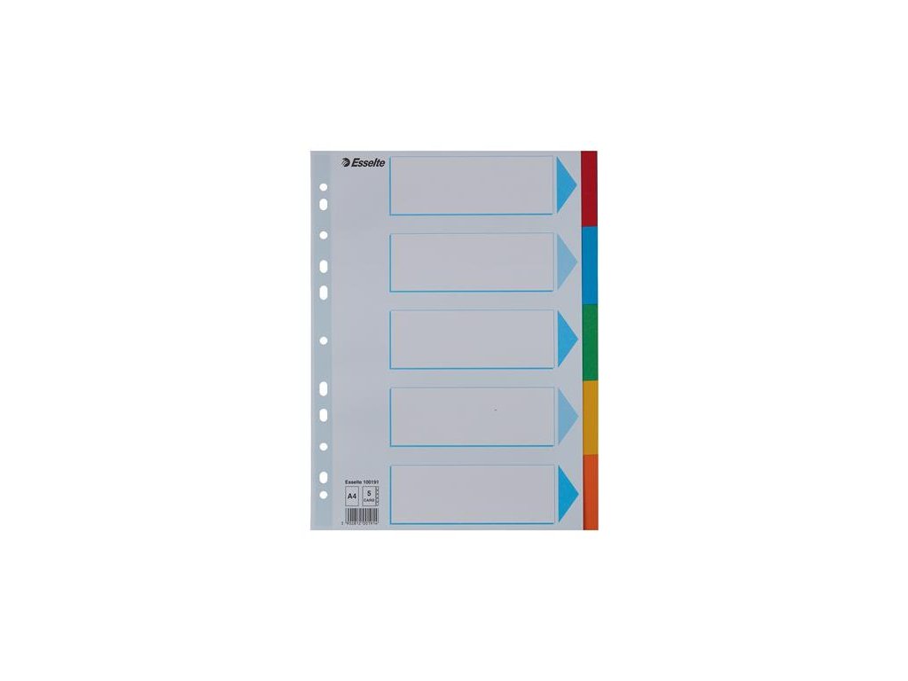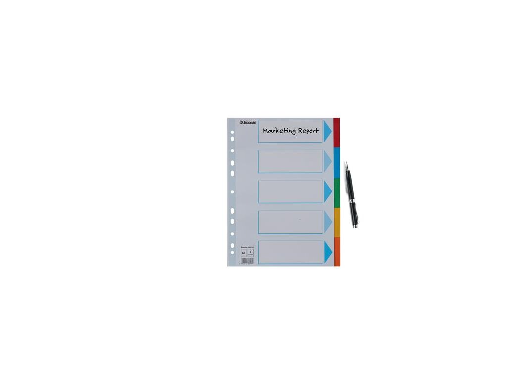 Rozlišovače zo silného recyklovaného kartónu pre triedenie dokumentov v zoraďovačoch či doskách do formátu A4, s popisovateľnou titulnou stranou, jednotlivé stránky v rôznych farbách, 5 dielov, univerzálna multiperforácia (11 dier) pre založenie do pákového i krúžkového zoraďovača Značka: ESSELTE Výrobca: Esselte Kft. Adresa: 1139 Budapest, Lomb u. 37-39. A ép. II. 8., Hungary Web: https://www.accobrands.com/brands/ Email: hungarymarketing@acco.comDodatočné parametre