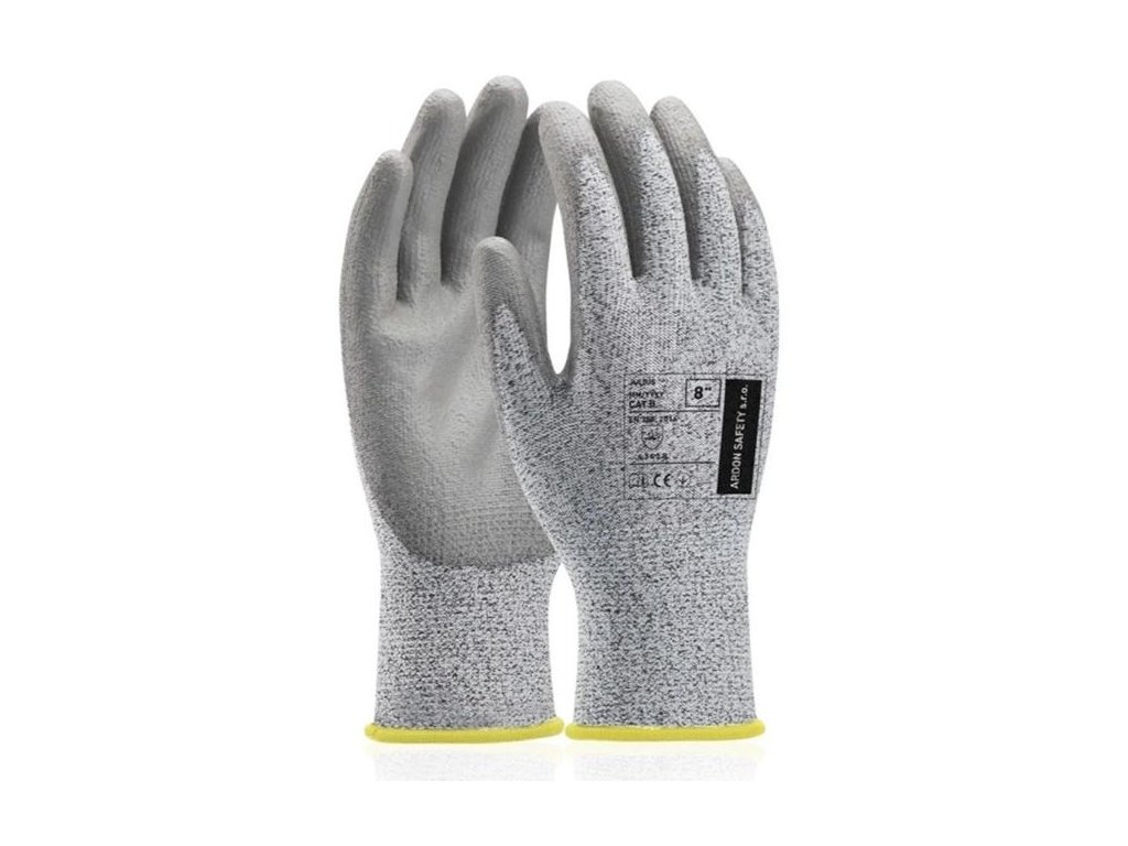 Syntetické rukavice s úpletom z vlákna s vysokou odolnosťou proti prerezaniu, máčané v polyuretáne.- materiál: polyester, protirezné vlákno (neobsahuje sklené vlákno)