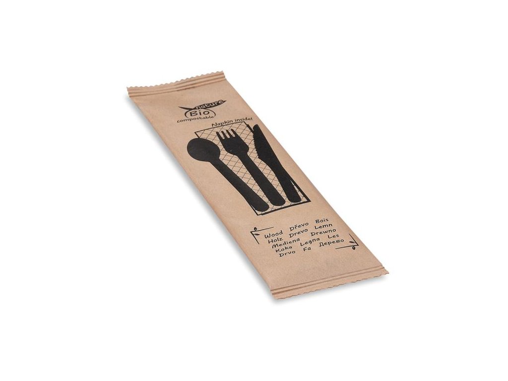 Sada dreveného príbora (nôž+vidlička+lyžica+obrúsok) hyg. balenie 50 sád