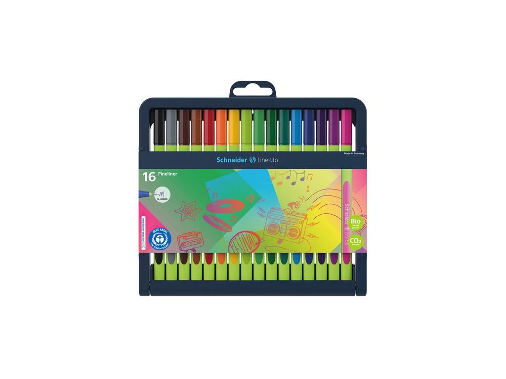 tenké a presné písmo plynulé písmo vďaka nehrdzavejúcemu hrotu atrament na báze vody zelené plastové telo telo v 88% z plastu s BIO základom gumované, trojuholníkové telo pera koniec pera sa zhoduje s farbou atramentu hrúbka písma: 0,4 mm 30 rôznych farieb astaviteľný držiak na linery vyrobený z recyklovaného plastu sada obsahuje 16 linerov v rôznych farbáchDodatočné parametre
