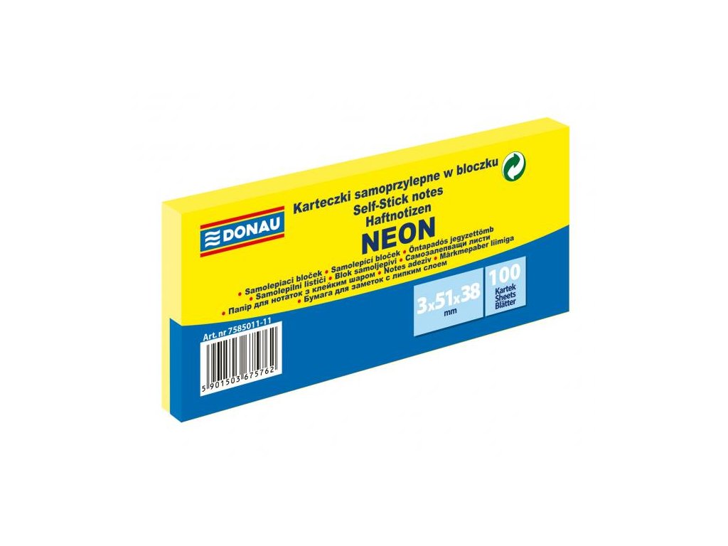 Univerzálne neónové samolepiace bločky z papiera gramáže 70 g / m², 100-lístkové, jednotlivo balené. Lepidlo nanesené po dlhšej strane, zmývateľné vodou. Udelený Green Point. 3 bločky vo fólii s červeným pruhom na uľahčenie otvárania. Väčšie balenie 36 ks. Farba neónovo žltá.Dodatočné parametre