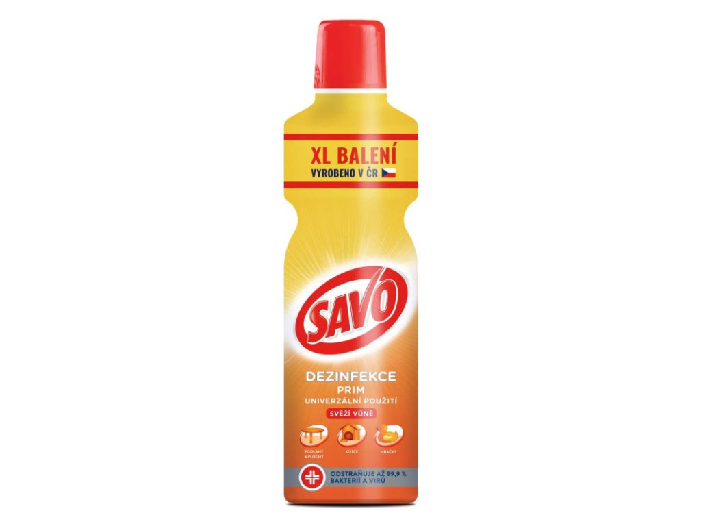 SAVO Prim Svieža vôňa 1,2 l SAVO Prim Svieža Vôňa je univerzálny dezinfekčný prostriedok, ktorý ponúka efektívne čistenie a dezinfekciu všetkých umývateľných povrchov vo vašej domácnosti. Spoľahlivo likviduje baktérie, vírusy, plesne aj kvasinky a zanecháva príjemnú sviežu vôňu, ktorá dodá vášmu domovu pocit čistoty a sviežosti. Vlastnosti: Univerzálne použitie: Ideálne na všetky umývateľné povrchy v domácnosti. Dezinfekčný účinok: Odstraňuje 99,9 % baktérií, vírusov, plesní a kvasiniek. Príjemná svieža vôňa: Osvieži váš domov pri každom použití. Bezpečné použitie: Vhodné aj na čistenie hračiek a pomôcok pre domácich miláčikov. Použitie: Aplikácia: Naneste prípravok na povrch pomocou hubky, handričky alebo rozprašovača. Čakanie na účinok: Nechajte pôsobiť podľa pokynov uvedených na obale. Čistenie: Povrch utrite vlhkou handričkou alebo opláchnite, pokiaľ ide o povrchy prichádzajúce do styku s potravinami. Ideálne na: Kuchynské a kúpeľňové povrchy Hračky a príslušenstvo pre domácich miláčikov Podlahy a ďalšie umývateľné plochy Cena je za bal./1,2 LDodatočné parametre