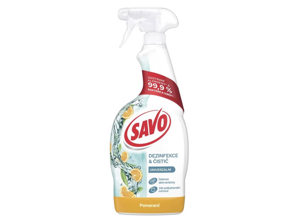 SAVO univerzálny sprej pomaranč 700 ml Univerzálny dezinfekčný a čistiaci sprej Savo Pomaranč a citrónová tráva je vynikajúcim pomocníkom pre celú domácnosť. Zbaví čistené povrchy nielen nečistôt, ale hlavne alergénov a zlikviduje až 99,9 % baktérií. Účinné zloženie bez obsahu chlóru zanecháva príjemnú vôňu bez chemického zápachu. Tekutý čistiaci a dezinfekčný prípravok v spreji má univerzálne bezoplachové použitie v celej domácnosti - je vhodný na všetky umývateľné povrchy v kúpeľni a kuchyni a tiež je ideálny pre domácnosti s domácimi maznáčikmi. Udržujte vašu domácnosť hygienicky čistú s univerzálnym sprejom Savo dezinfekcia & čistič Pomaranč a citrónová tráva. Popis produktu tekutý univerzálny prípravok v spreji Savo - Pomaranč a citrónová tráva bezoplachové zloženie čistí a dezinfikuje rôzne povrchy v domácnosti účinne odstraňuje alergény a likviduje až 99,9 % baktérií vhodný na dennú dezinfekciu vášho domova, odstráni aj silné nečistoty príjemná vôňa a antibakteriálna ochrana až na 24 hodín Cena je za bal./700mlDodatočné parametre