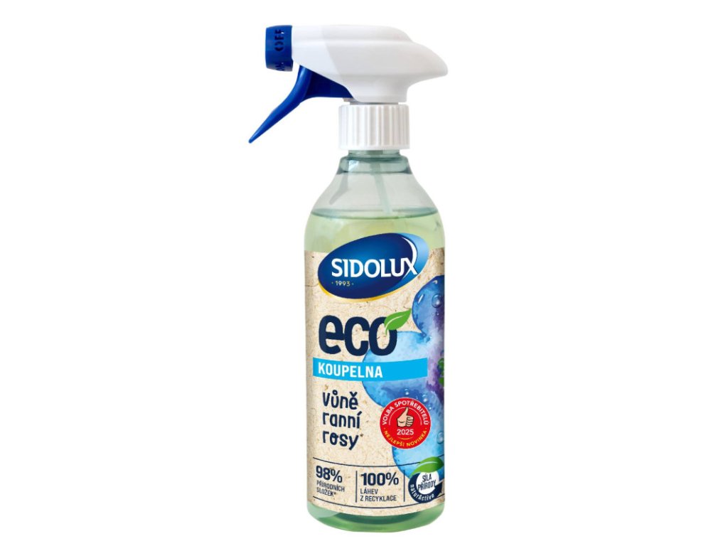 SIDOLUX ECO na kúpeľne 500ml Sidolux Eco je ekologický rad čistiacich prostriedkov, ktorý kombinuje účinnosť s ohľadom na prírodu. Obsahuje 96% prírodných zložiek, je certifikovaný environmentálnou značkou, je balený v recyklovanej fľaši a štítok je vyrobený z cukrovej trstiny. Sidolux Eco ponúka univerzálne aj špecializované čistiace prostriedky pre každú domácnosť a v roku 2025 získal cenu „Volba spotřebitelů“ v kategórii Eco čistiace prostriedky. Vlastnosti: Prírodné zloženie a priateľskosť k planéte Efektívne čistenie vďaka technológii NaturActive Ocenená kvalita a široká škála výrobkov Príjemná vôňa rannej rosy Použitie: Naneste prostriedok priamo na povrch a potom utrite čistou handričkou alebo špongiou. V prípade odolnejších nečistôt nechajte produkt pôsobiť asi jednu minútu a potom utrite suchou handričkou. Pred použitím na citlivých povrchoch sa odporúča testovať na menej viditeľnom mieste. Výrobok nie je určený na čistenie veľkých plôch. Tri tipy na efektívne čistenie so sériou Sidolux Eco: Použite presné dávkovanie Nepoužívajte viac zdrojov, ako je potrebné - šetrí to prírodu a vašu peňaženku. Používajte utierky a špongie Namiesto jednorazových papierových obrúskov vyberte umývateľné utierky alebo špongie, ktoré môžete opakovane používať. Pravidelne plánujte čistenie Pravidelné čistenie zabraňuje usadzovaniu odolných nečistôt, takže stačí menej prostriedkov a menej úsilia. Cena je za bal./500mlDodatočné parametre