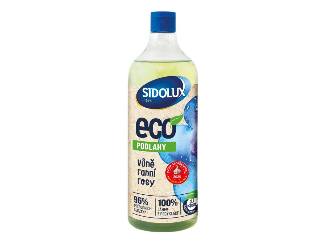 SIDOLUX ECO na podlahy 1000ml Sidolux Eco je ekologický rad čistiacich prostriedkov, ktorý kombinuje účinnosť s ohľadom na prírodu. Obsahuje 96% prírodných zložiek, je certifikovaný environmentálnou značkou, je balený v recyklovanej fľaši a štítok je vyrobený z cukrovej trstiny. Sidolux Eco ponúka univerzálne aj špecializované čistiace prostriedky pre každú domácnosť a v roku 2025 získal cenu „Volba spotřebitelů“ v kategórii Eco čistiace prostriedky. Vlastnosti: Prírodné zloženie a priateľskosť k planéte Efektívne čistenie vďaka technológii NaturActive Ocenená kvalita a široká škála výrobkov Príjemná vôňa rannej rosy Použitie: Naneste prostriedok priamo na povrch a potom utrite čistou handričkou alebo špongiou. V prípade odolnejších nečistôt nechajte produkt pôsobiť asi jednu minútu a potom utrite suchou handričkou. Pred použitím na citlivých povrchoch sa odporúča testovať na menej viditeľnom mieste. Výrobok nie je určený na čistenie veľkých plôch. Tri tipy na efektívne čistenie so sériou Sidolux Eco: Použite presné dávkovanie Nepoužívajte viac zdrojov, ako je potrebné - šetrí to prírodu a vašu peňaženku. Používajte utierky a špongie Namiesto jednorazových papierových obrúskov vyberte umývateľné utierky alebo špongie, ktoré môžete opakovane používať. Pravidelne plánujte čistenie Pravidelné čistenie zabraňuje usadzovaniu odolných nečistôt, takže stačí menej prostriedkov a menej úsilia. Cena je za bal./1000mlDodatočné parametre