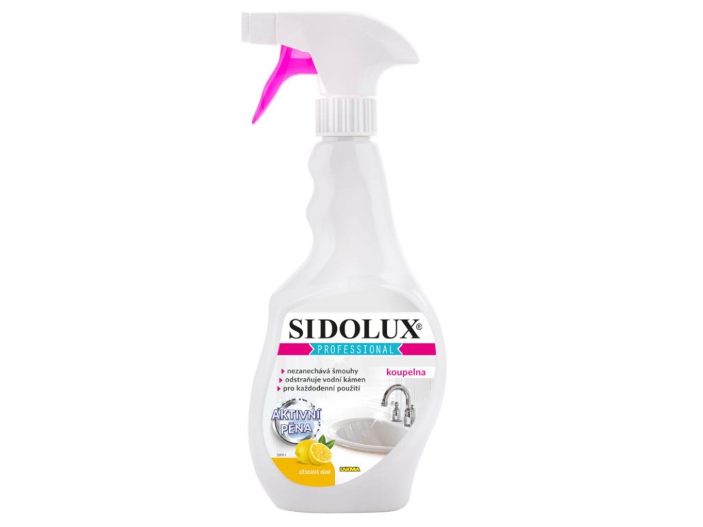 SIDOLUX PROFESSIONAL na kúpeľne - aktívna pena 500ml Je určený na udržanie hygienickej čistoty v kúpeľniach. Vďaka špeciálnej receptúre ľahko a účinne odstraňuje vodný kameň, zvyšky mydla a iné nečistoty z vodovodných batérií, sprchových zásten, umývadiel, vaní. Prostriedok vytvára aktívnu penu, ktorá dlhší čas pôsobí na čistený povrch. Zanecháva príjemnú sviežu ovocnú vôňu. Sidolux professional aktívna pena na kúpeľne je praktický pomocník pre každú domácnosť, ktorá dbá na svieži a hygienicky čistý vzhľad kúpeľne. Aktívna pena sa ľahko aplikuje, zostáva na povrchu dlhšiu dobu a umožňuje efektívne odstránenie usadenín, aby batérie, sprchové zásteny, umývadlá a vane vyzerali ako nové. Vlastnosti: Silná aktívna pena, ktorá dlhšie priľne na čistenej ploche Vhodné pre batérie, sprchové zásteny, vane a umývadlá Rýchle a jednoduché použitie doma bez nutnosti profesionálneho vybavenia Príjemná citrusová vôňa po čistení pre svieži pocit v kúpeľni Praktické balenie 500ml s rozprašovačom na penu pre lepšie dávkovanie Použitie: Striekajte penu rovnomerne na postihnuté miesta pre najlepší účinok Pri ťažko dostupných škárach použite malú kefku na dôkladné vyčistenie Pravidelná údržba predlžuje vzhľad a funkčnosť kúpeľňových povrchov Produkt aplikujte vo forme peny priamo na čistený povrch. Nechajte pôsobiť približne 1 minútu, pri silnejších usadeninách nechajte pôsobiť dlhšiu dobu. Po uplynutí doby povrch zotrite hubkou, kefkou alebo iným vhodným predmetom podľa povahy povrchu. Nakoniec povrch dôkladne opláchnite vodou, aby zostal suchý a lesklý.. Sidolux professional ponúka spojenie praktickej aplikácie a spoľahlivého výsledku. Vďaka aktívnej pene dosiahnete čistý povrch rýchlo a bez zbytočnej námahy. Balenie 500ml s rozprašovačom umožňuje ľahké dávkovanie a dlhodobé používanie v domácnosti. Cena je za bal./500mlDodatočné parametre