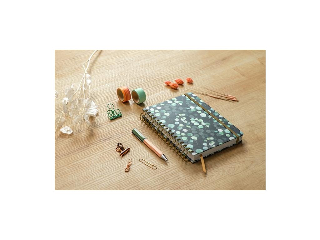Špirálový zošit s tvrdou obálkou, s motívom eukaliptu -matný motív - zelená špirálová väzba -mikroperforované listy -240 bodkovaných strán -120 g biely papier -vrecko na zadnej stane obalu -70% používaného materiálu s certifikátom FSC -vegánsky produktZnačka: SIGEL