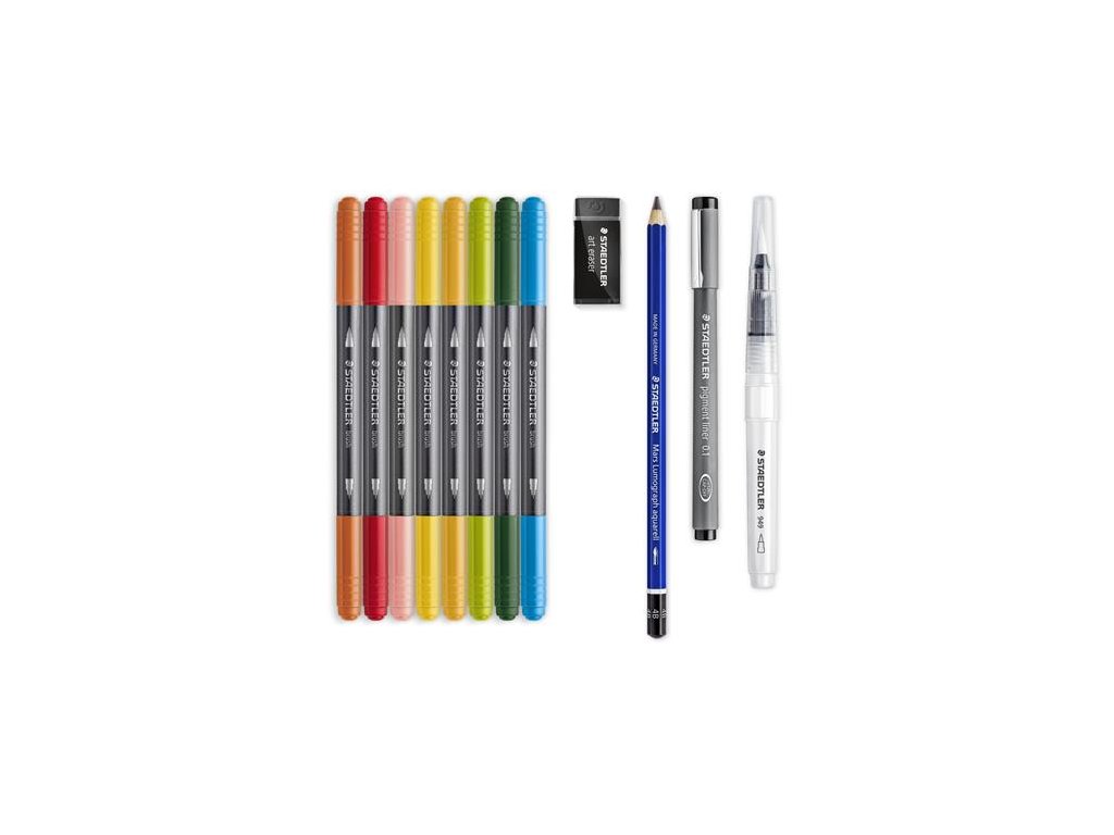 Obojstranný štetec s mäkkými špičkami, ideálny na kreslenie, vyfarbovanie, ilustráciu. - obojstranný štetec s mäkkými špičkami - tenký liner na kontúrovanie - grafitová ceruzka spĺňajúca požiadavky udržateľného lesného hospodárstva - plastový, vodou naplnitelný štetec, ktoý umožňuje správne dávkovanie vody - čierny rasoplast s gumou B30 - závesná krabica STAEDTLER, ktorá zviditeľňuje výrobky v nej - súprava obsahuje podrobnú používateľskú príručku a podrobný popis použitia na zadnej strane balenia - ideálne pre tých, ktorí chcú vytvárať naozaj špeciálne texty a vzory Značka: STAEDTLER Výrobca: STAEDTLER SE Adresa: Moosäckerstr. 3 , 90427 Nuremberg, Germany Web: http://www.staedtler.com Email: https://www.staedtler.com/intl/en/service/contact/Dodatočné parametre