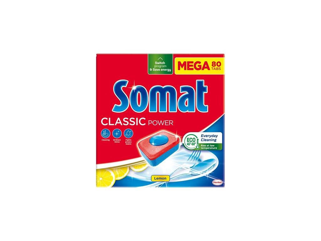 Somat Classic Lemon tablety do umývačky riadu vo veľkom balení, ktoré účinne čistia a zabezpečujú žiarivý lesk aj pri používaní ECO programov s nízkou teplotou alebo krátkych programov pri nízkej teplote.