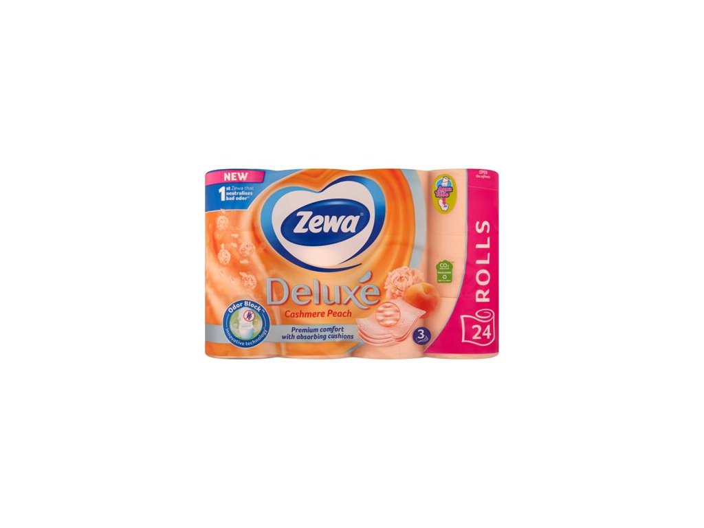 Vylepšené produkty s vôňou Zewa Deluxe majú účinok neutralizujúci zápach (technológia Odor Block). Toaletný papier neutralizuje nepríjemné pachy prichádzajúce z toalety. Vďaka inovatívnej technológii dodáva miestnosti príjemnú vôňu. - tri vrstvy - mäkké, jemné na dotyk - s broskyňovou vôňou - balenie: 24 roliek/balDodatočné parametre