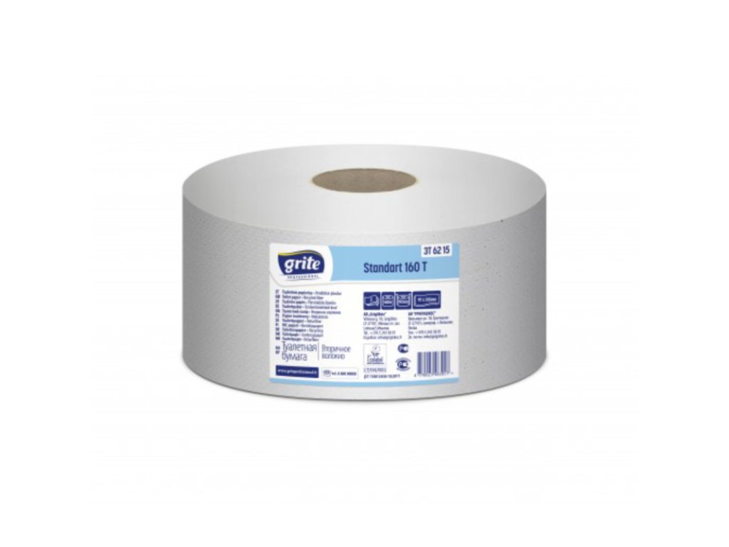 Toaletný papier JUMBO 180 -GRITE 160m standart professional 12ks Materiál : 100% recyklovaný papier Ø 19 cm, Počet vrstiev: 2 Farba: 75% belosť Návin:160 m Cena za balenie 12 ksDodatočné parametre