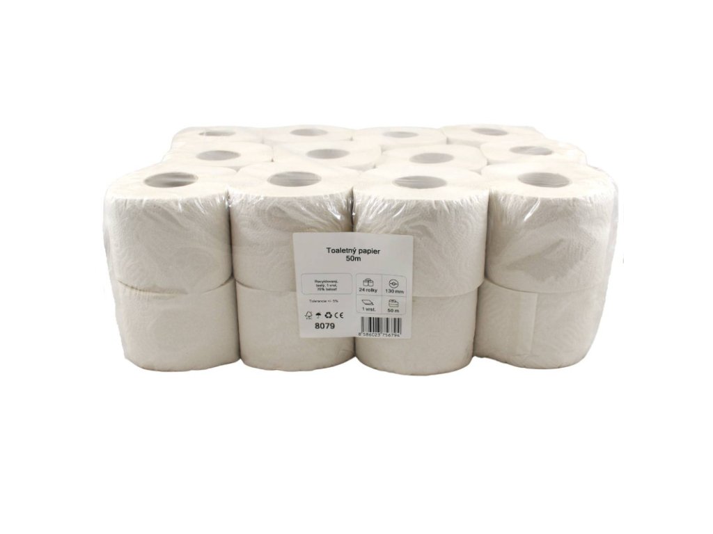 Toaletný papier Economy 1 vrst., 50m - 24ks Materiál: 100% recyklovaný papier, 70% belosť Dĺžka návinu: 50m Farba: biela Počet vrstiev: 1 Cena je za bal./24ksDodatočné parametre