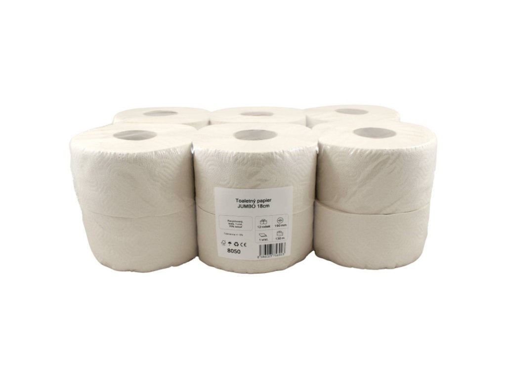 Toaletný papier JUMBO Ø 18cm 130m 1vr.70% belosť recykel 12ks Toaletný papier recyklovaný Ø 18 cm, 2 vrstvový, 70% belosť, 130 m, Cena za balenie 12 ksDodatočné parametre