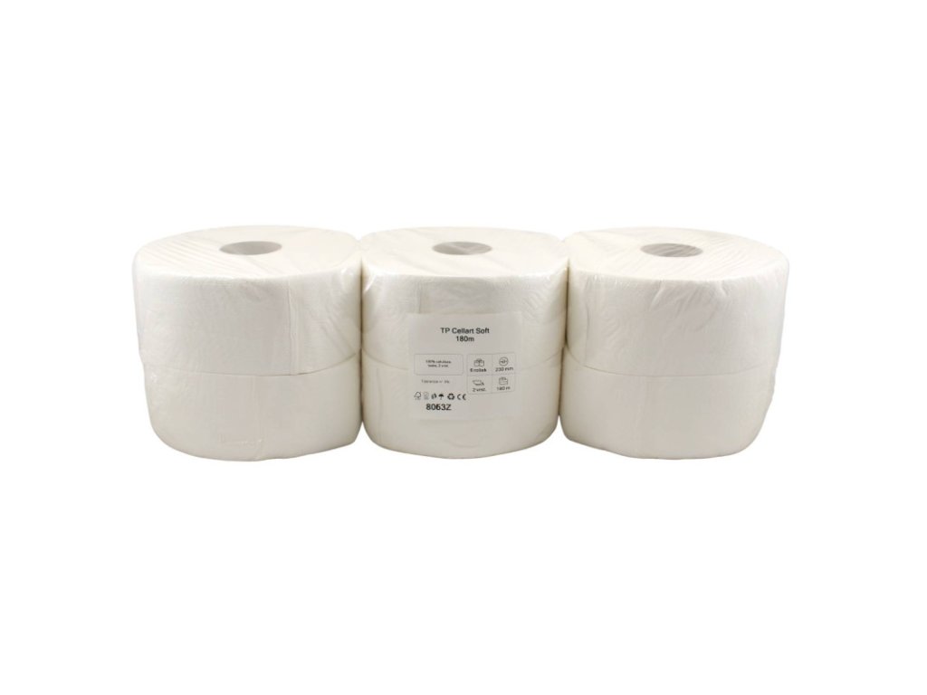 Toaletný papier SOFT JUMBO Ø 23cm, 180m 2vrst. 6ks Materiál: 100% celulóza Dĺžka návinu: 180 m Farba: biela Počet vrstiev: 2 Balenie : 6ksDodatočné parametre