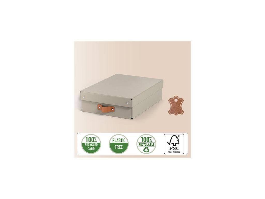 Súprava dvoch stredne veľkých nízkych úložných boxov s vekom vyrobených zo 100% recyklovanej lepenky s certifikátom FSC v modernom a čistom dizajne, ktorý doplní vašu domácnosť aj kanceláriu.