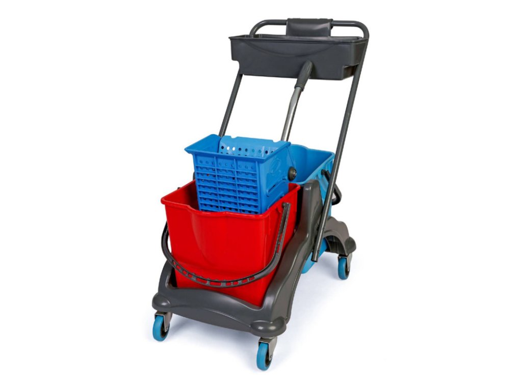 Upratovací vozík plastový 2 x 18l vedrá s plochým žmýkačom, vanička Tento upratovací vozík s dvoma vedrami patrí medzi obľúbené upratovacie vozíky. Rám vozíka je vyrobený z tvrdeného plastu. Rukoväť vozíka je vyrobená z pevnej chrómovanej kovovej trubky a je na obe strany preklápateľná. Vozík obsahuje 2 ks vedier, ktoré sú farebne rozlíšené s objemom 18 litrov. Obsahuje žmýkací lis na žmýkanie mopov a vaničku na upratovacie pomôcky. Má 4 otočné kolieska s plastovými chráničmi proti poškodeniu koliesok a stien. Vozík je vhodný na umývanie chodieb, kuchýň, kancelárií, skladov, schodísk, výrobných hál a iných malých a veľkých priestorov... Ideálny pre firmy, úrady, budovy, sklady, hotely, výrobné závody, bytové domy, školy, kancelárie, obchodné domy, nemocnice. Tento upratovací vozík poskytuje vysoký komfort pri upratovaní. Poskytuje veľmi dobrú skladovateľnosť a manipuláciu. Príslušenstvo: Konštrukcia tvrdený plast - ŠEDÁ 2 x 18 l vedrá farebne rozlíšené 4 otočné kolieska s plastovými chráničmi proti poškodeniu stien a zariadenia Žmýkač (lis) na žmýkanie mopu Vanička pre upratovacie pomôcky Rozmery vozíka v zloženom stave: šírka 42 cm x dĺžka 70 cm x výška 82 cm Balenie obsahuje 1 ks vozíka s príslušenstvom.Dodatočné parametre