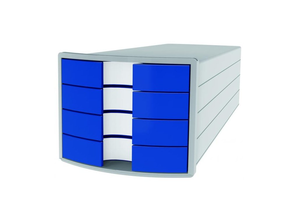 Box so štyrmi zatvorenými zásuvkami v tvare počítačového monitora.Rozmery (š × v × h) 294 × 235 × 368 mm.Farba boxu/zásuvky: sivá/modrá