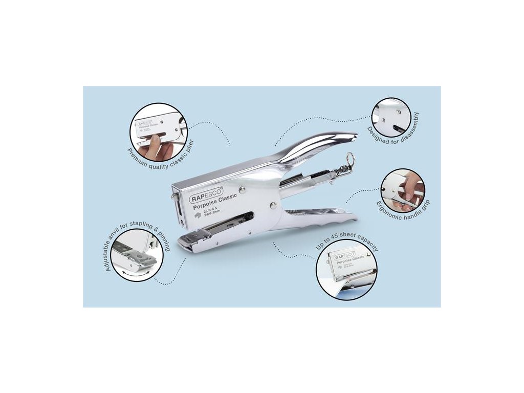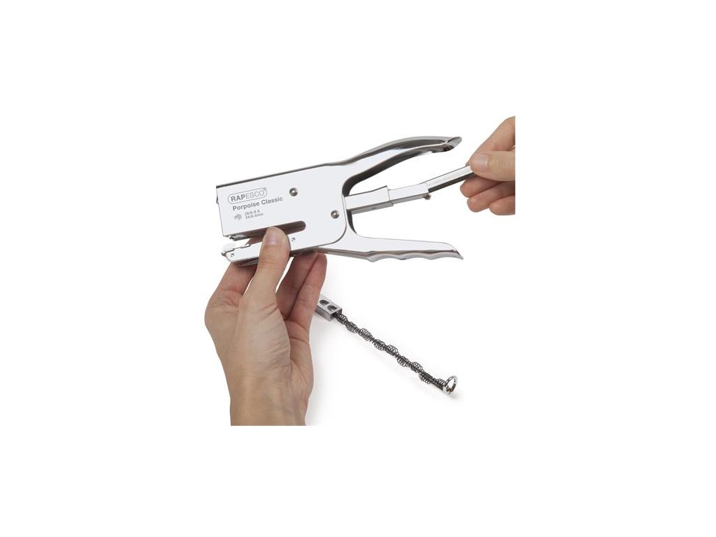 Klasická zošívačka Rapesco Porpoise, ideálna na rýchle zošívanie a balenie - ručná zošívačka - kovové telo, kovová konštrukcia - zadné nabíjanie, dá sa dobiť stlačením alebo odopnutím zadnej pružiny - kapacita dosky: 6 mm: 20 listov, 8 mm: 45 listov - spinky: 26/6, 26/8, 24/6, 24/8 - darček: spinky: nie - rozmer: 175 mm x 22 mm x 92 mm - záruka: 15 rokov Značka: RAPESCO Výrobca: Rapesco-Tacwise BV Adresa: Kraijenhoffstraat, 137A, 1018RG Amsterdam, Netherlands Web: www.rapesco.com Email: support@rapesco-tacwise.nlDodatočné parametre
