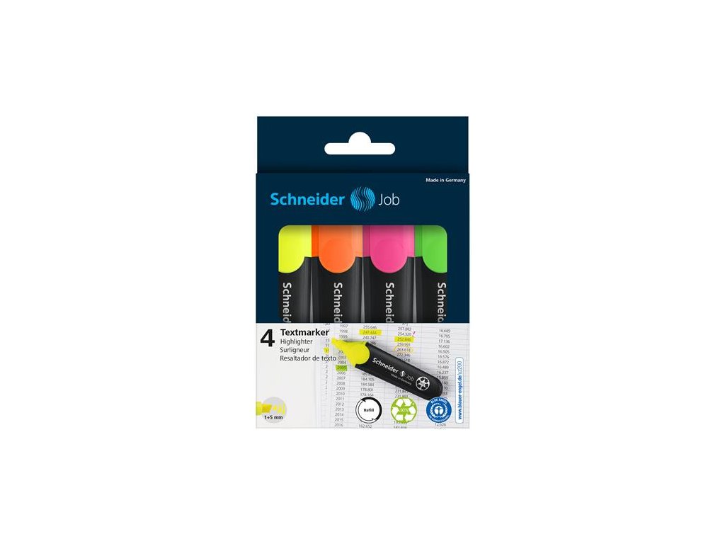 Zvýrazňovač, sada, 1-5 mm, SCHNEIDER "Job 150", 4 rôzne farby